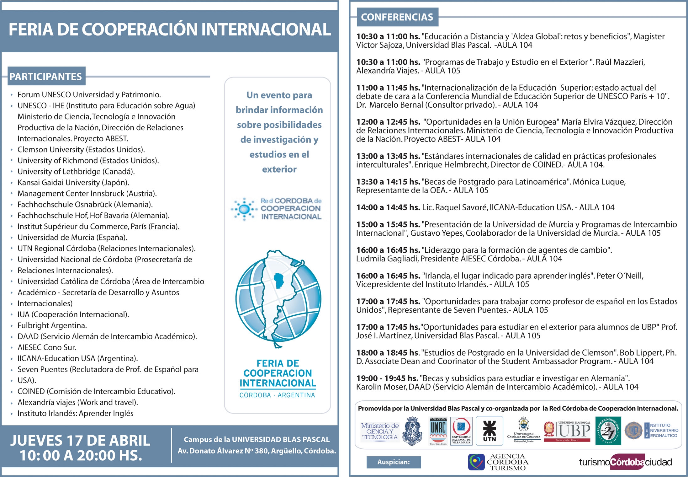 La Feria de Cooperación Internacional está organizada por Red Córdoba de Cooperación Internacional, la cual está integrada por: Universidad Nacional de Córdoba; Universidad Nacional de Villa María, Universidad Nacional de Río Cuarto, Universidad Tecnológica Nacional - Facultades Regionales de Córdoba, San Francisco y Villa María-, Universidad Católica de Córdoba, Universidad Siglo 21, Universidad Blas Pascal, Instituto Universitario Aeronáutico y Ministerio de Ciencia y Tecnología del Gobierno de Córdoba.